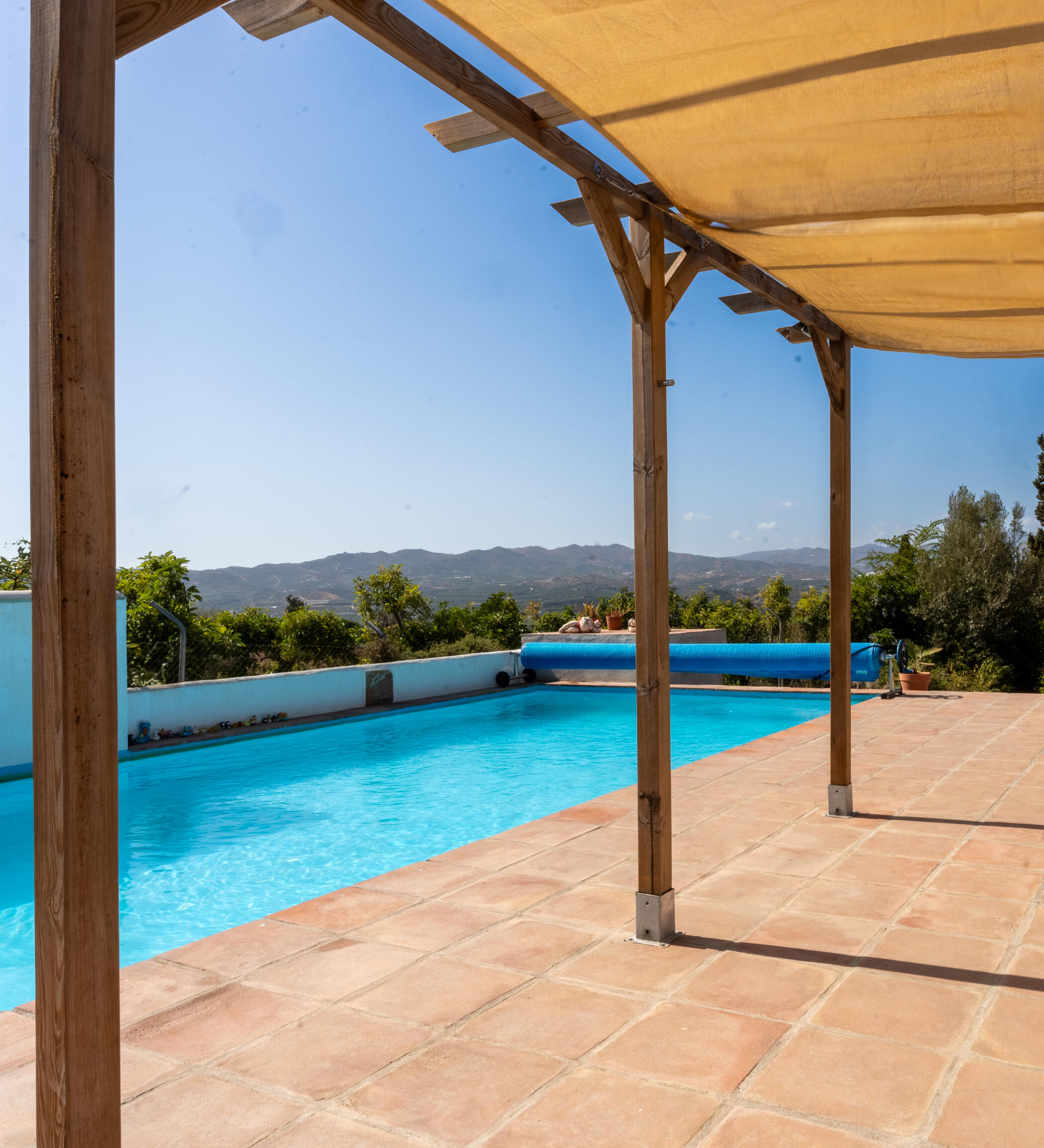 Finca la Loman uima-allasalue on paikka, jossa aika pysähtyy. Altaan sininen vesi sulautuu taivaan sävyihin, ja ympärillä avautuvat henkeäsalpaavat näkymät Axarquían laaksoon – vihreiden oliivilehtojen, valkoisten kylien ja kaukaisten vuorten mosaiikkiin.Aamuauringon ensimmäiset säteet kutsuvat pulahtamaan raikkaaseen veteen, ja iltapäivisin voit rentoutua aurinkotuolissa kylmän juoman ja lintujen laulun säestyksellä. Kun ilta laskee, altaan pinta heijastaa taivaan värit, ja maisema muuttuu rauhalliseksi postikortiksi, jota tekee mieli jäädä katsomaan.Uima-allasalue on Finca la Loman sydän – paikka, jossa Andalusian valo, lämpö ja hiljaisuus kohtaavat täydellisessä tasapainossa.